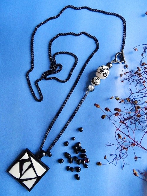Necklace - square micro-mosaic black pendant - black & white geometry